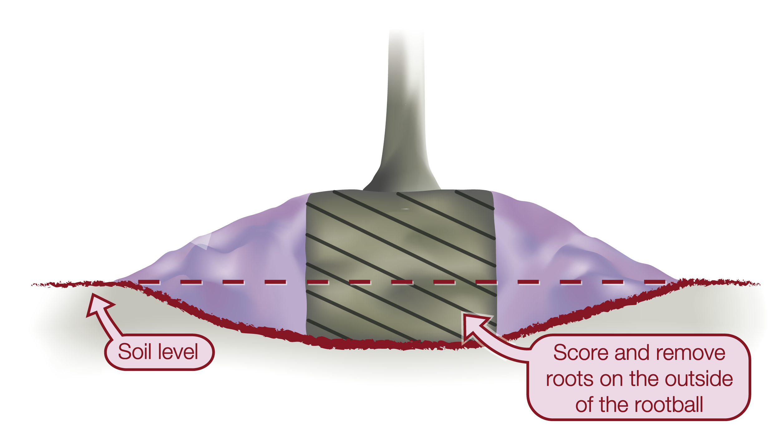 dig a tapered shallow hole about HALF the height of the rootball, with sides three times the width. Make sure to keep over half of the rootball above soil level! (Reserve any native soil removed from the ground for the next step.) If you’re planting in heavy clay or excessively wet areas, plant the rootball even higher.
