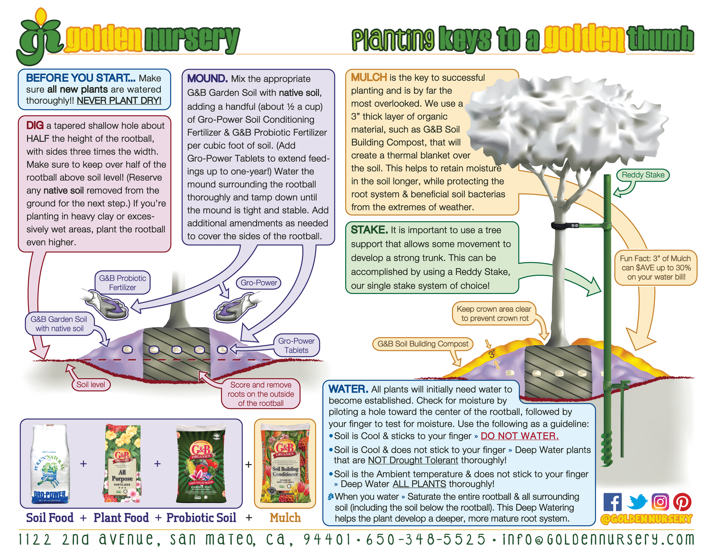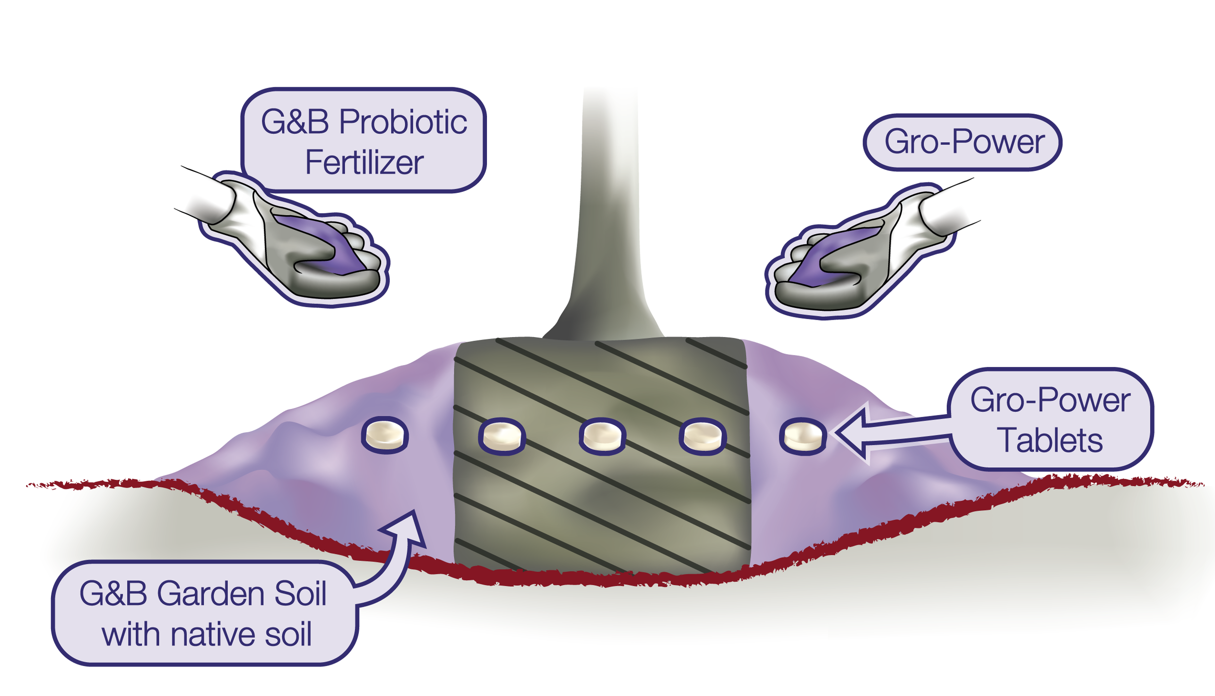 mix the appropriate G&B Garden Soil with native soil, adding a handful (about ½ a cup) of Gro-Power Soil Conditioning Fertilizer & G&B Probiotic Fertilizer per cubic foot of soil. (Add Gro-Power Tablets to extend feedings up to one-year!) Water the mound surrounding the rootball thoroughly and tamp down until the mound is tight and stable. Add additional amendments as needed to cover the sides of the rootball.