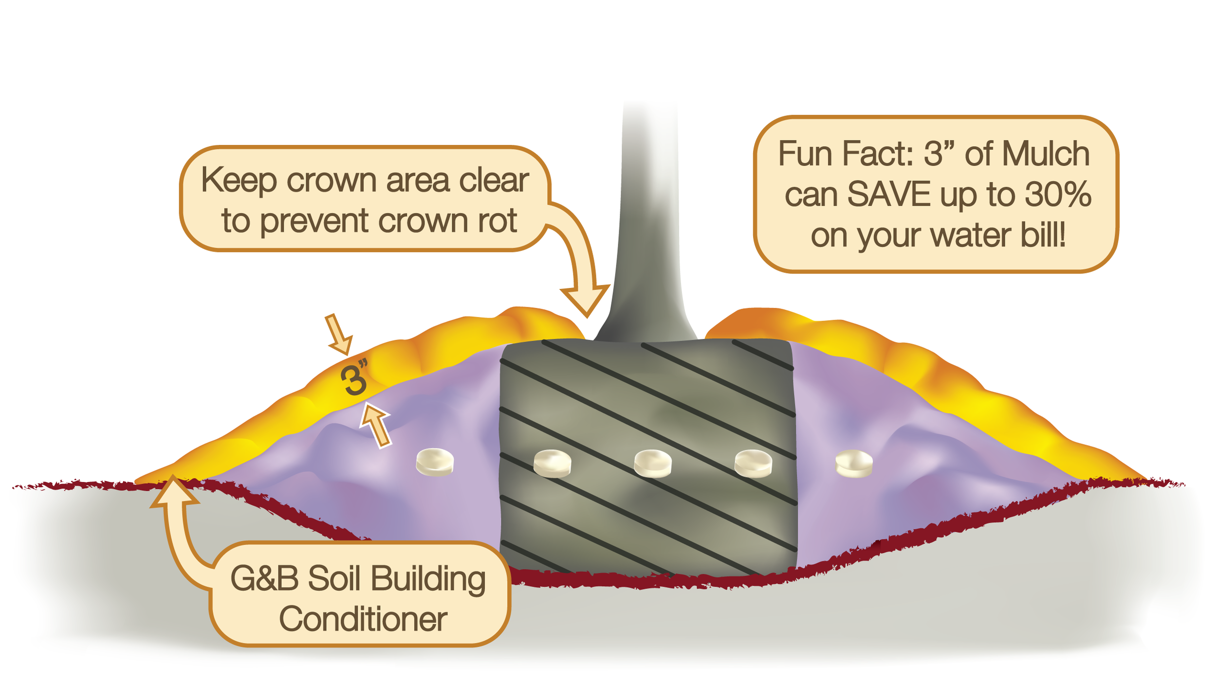mulch is the key to successful planting and is by far the most overlooked. We use a 3” thick layer of organic material, such as G&B Soil Building Compost, that will create a thermal blanket over the soil. This helps to retain moisture in the soil longer, while protecting the root system & beneficial soil bacterias from the extremes of weather.
